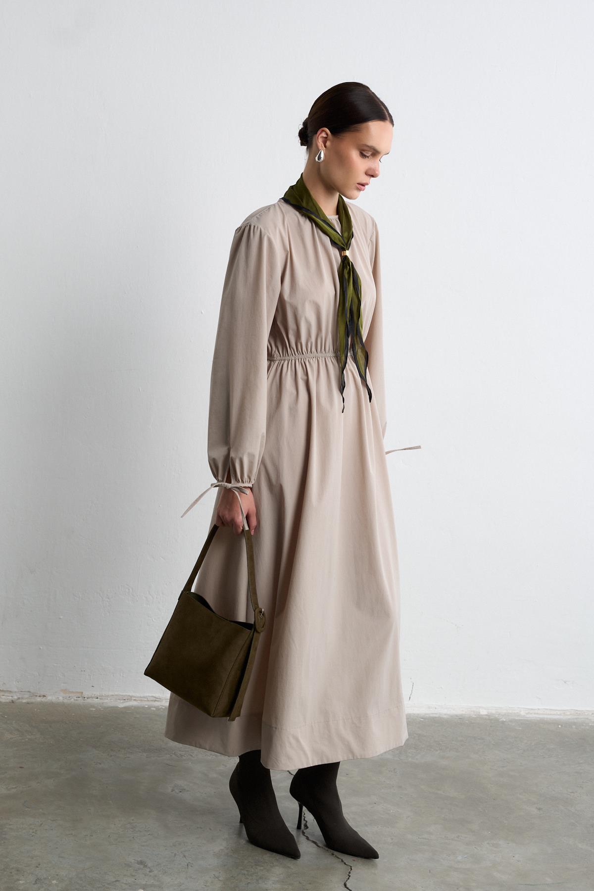 BELİ BÜZGÜLÜ ELBİSE BEJ
