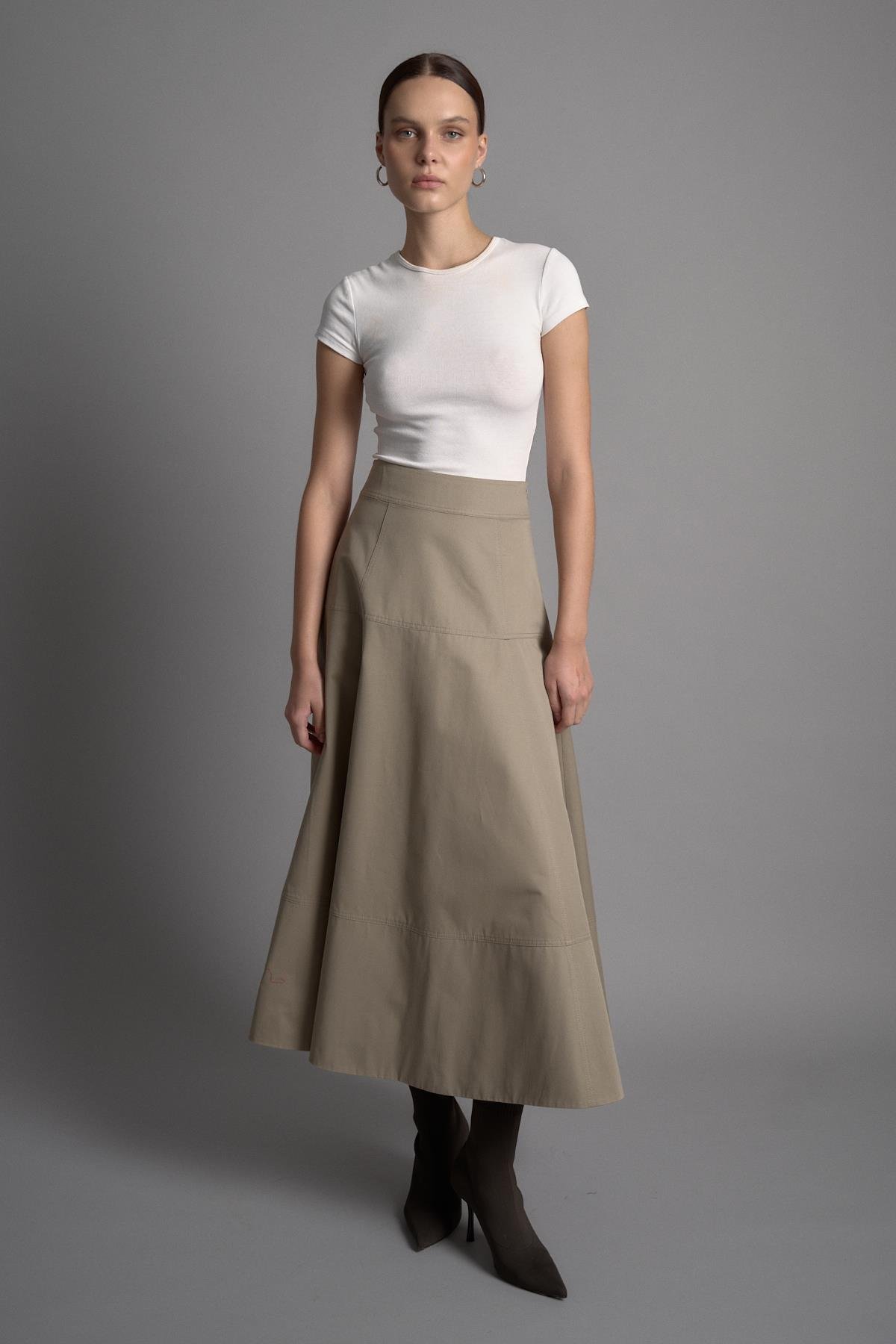 Dayanıklı kanvas dokusuyla öne çıkan Motion Etek, çan kesimi ve sportif formuyla modern bir siluet sunuyor. Renklerin sıcak tonları, kombinlerinize sofistike bir dokunuş katarken; yüksek bel tasarımı ve ekleyeceğiniz kemer aksesuarınızla hem şık hem de fonksiyonel bir kullanım sağlıyor. Günlük şehir stilinden özel buluşmalara kadar zamansız bir şıklık sunan bu parça, gardırobunuzun öne çıkan klasiklerinden olacak.