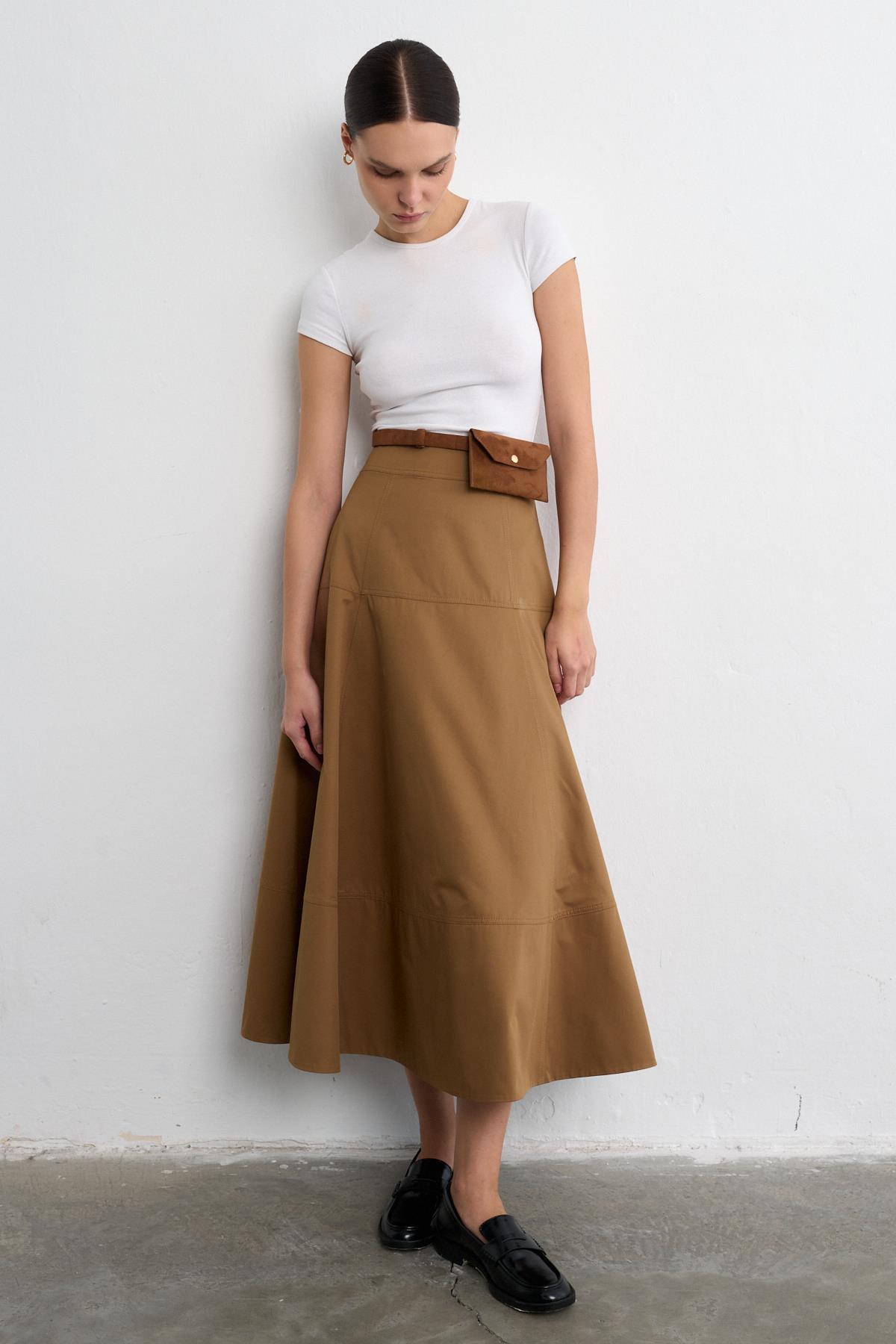 Dayanıklı kanvas dokusuyla öne çıkan Motion Etek, çan kesimi ve sportif formuyla modern bir siluet sunuyor. Renklerin sıcak tonları, kombinlerinize sofistike bir dokunuş katarken; yüksek bel tasarımı ve ekleyeceğiniz kemer aksesuarınızla hem şık hem de fonksiyonel bir kullanım sağlıyor. Günlük şehir stilinden özel buluşmalara kadar zamansız bir şıklık sunan bu parça, gardırobunuzun öne çıkan klasiklerinden olacak.